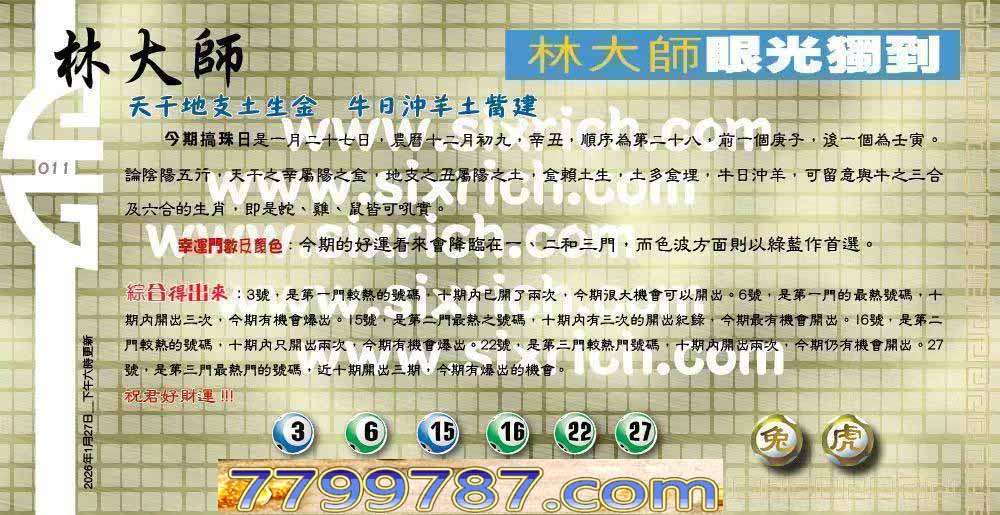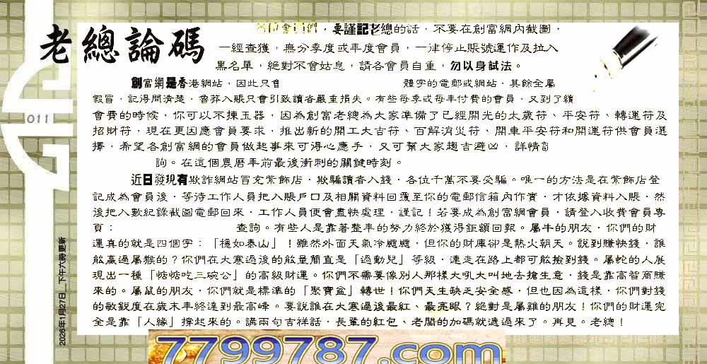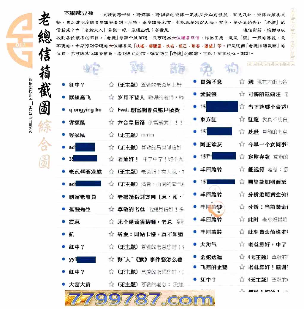 | 主题 :011期:六合皇金句/老总论码/萧公子/林大师/五行夺码/老总信箱截 |