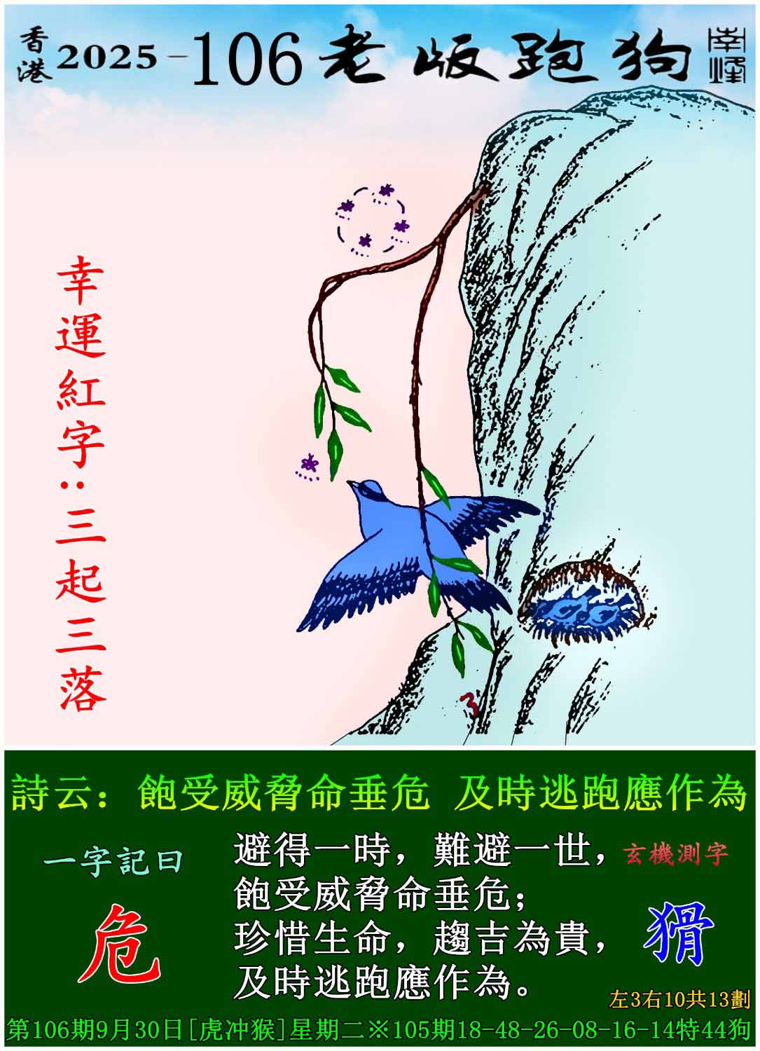 | 主题 :106期老版跑狗一字記之曰:【危】 玄機測字:《猾》 |