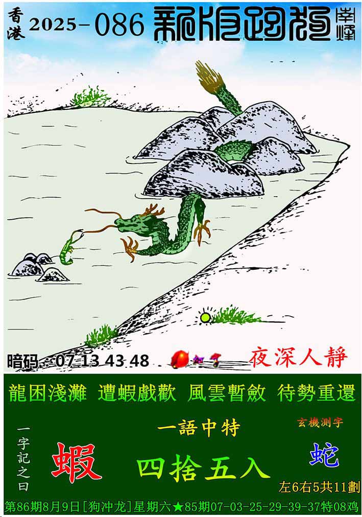 | 主题 :086期:新版跑狗一字記之曰【蝦】 玄機測字:【蛇】 |