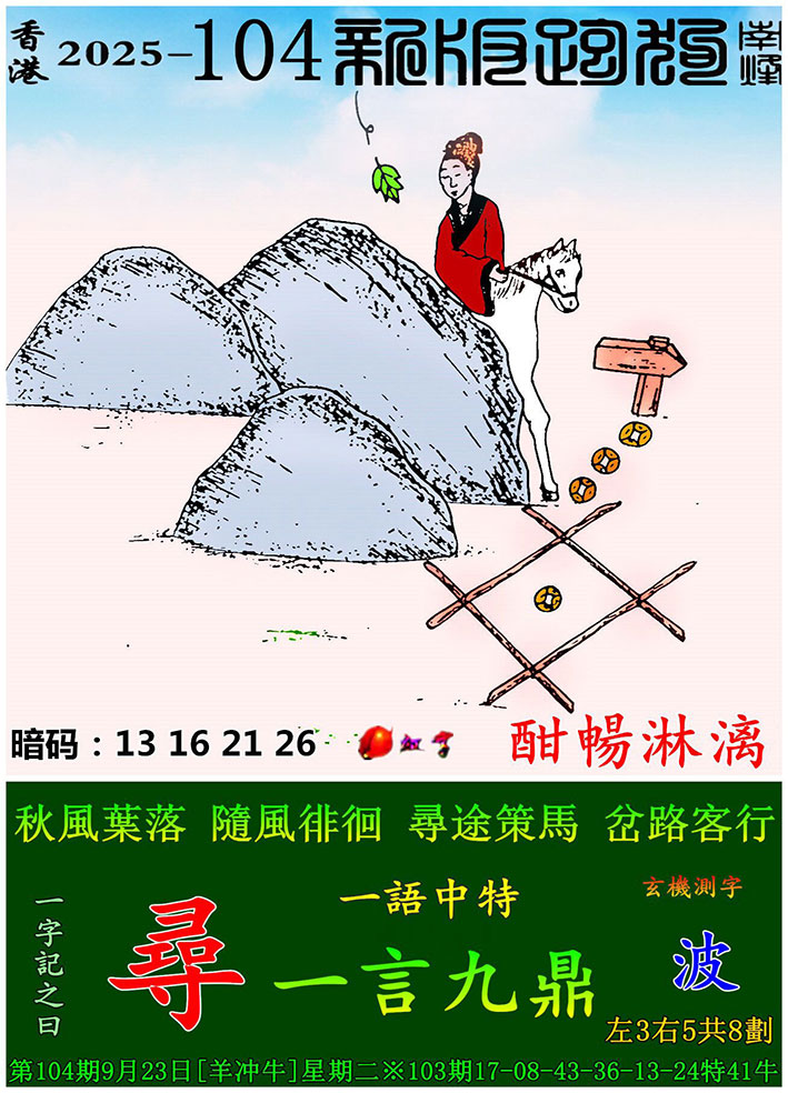 | 主题 :104期:新版跑狗一字記之曰【尋】 玄機測字:【波】 |