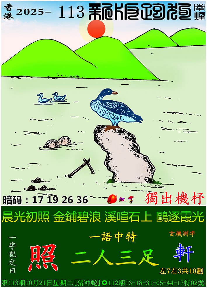 | 主题 :113期:新版跑狗一字記之曰【照】 玄機測字:【軒】 |