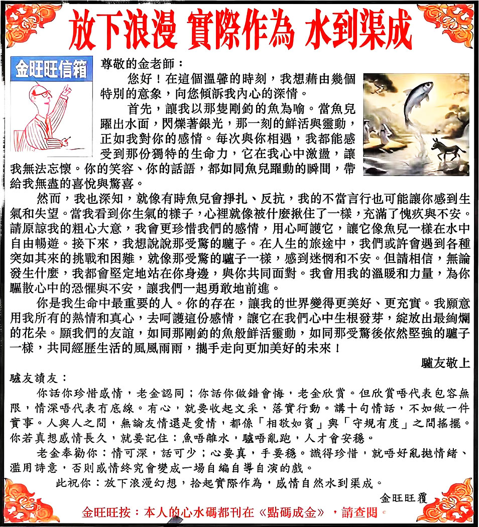 | 主题 :103期:金旺旺信箱彩民推荐→→《放下浪漫 實際作為 水到渠成》 |