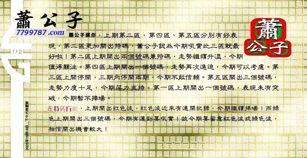 | 主题 :112期:六合皇金句/老总论码/萧公子/林大师/五行夺码/老总信箱截 |