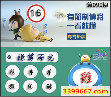 099期正版彩图挂:16 爆:鸡 挂牌成语:谦尊而光 挂牌出肖:龙牛羊猴虎猪